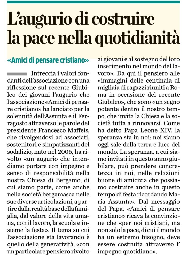 “Come papa Leone XIV ha già ricordato in diverse occasioni, la speranza siamo noi – sottolinea il commendator Francesco Maffeis, presidente dell’associazione “Amici di Pensare Cristiano”, patron dell’iniziativa -. Noi imprenditori, junior e senior, abbiamo il dovere di incarnare, con la nostra vita, la nostra professione, le nostre scelte, fatte con coraggio, visione e determinazione, la speranza per il mondo. In questo momento difficile siamo chiamati a rigenerare, non limitandoci al solo profitto, ma puntando ad un’autentica crescita umana”.